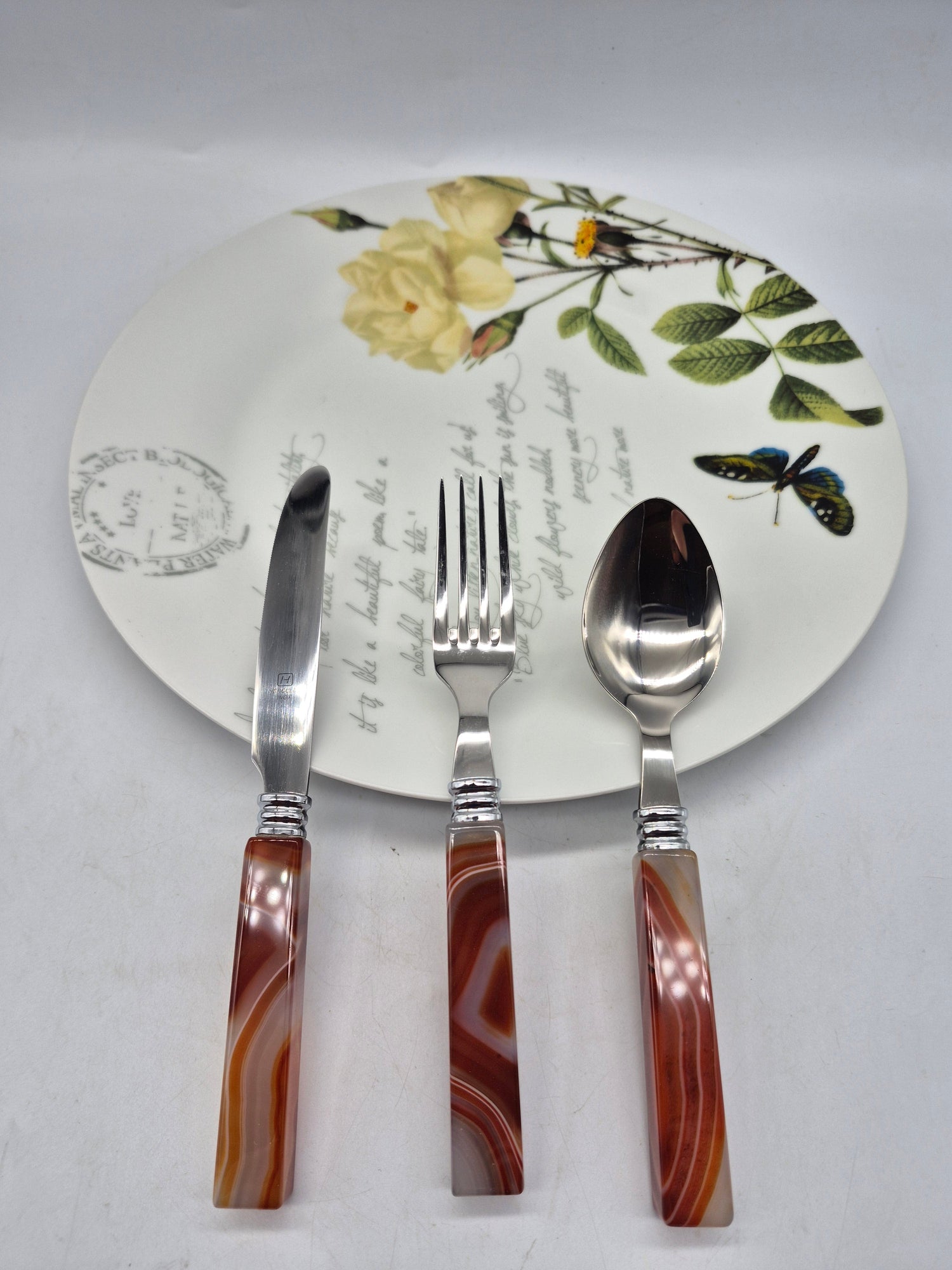 An amazing collection of brazilian agate crystals with stainless steels cutlery and...