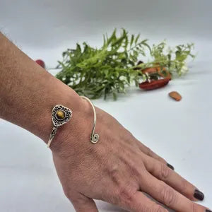 Add a touch of elegance and grounding energy to your wrist with this beautiful Silver-Plated Tiger Eye Adjustable Bangle Bracelet. Featuring a stunning tiger eye stone, known for its protective and energizing properties, this bracelet brings a perfect balance of style and spiritual significance.