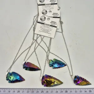 Shine with mystical colors and protective energy with this Aura Titanium Obsidian Arrow Necklace. The raw black obsidian arrow pendant is coated with an iridescent titanium aura finish, reflecting shimmering hues of blue, purple, and gold. Suspended on a durable stainless steel chain, this necklace blends natural crystal energy with modern style.